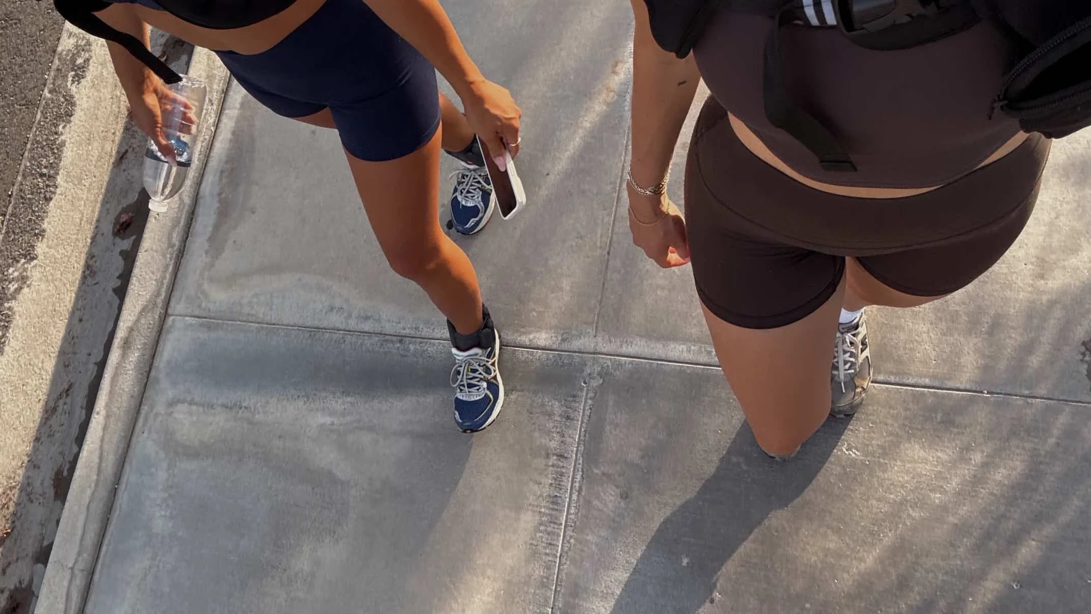 A person wearing beige sneakers and beige pants holding a white water bottle, standing on a concrete staircase seen from above.